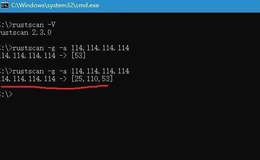 用法:将程序解压到任意位置,命令行跳转到程序所在位置。简单示例 rustscan -g -a 114.114.114.114,即可扫描所有端口。去掉-g会提高扫描速度