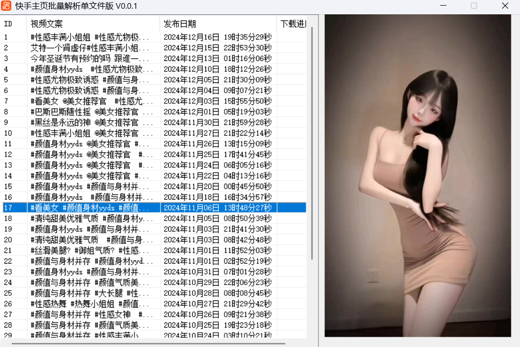 今天上网冲浪的时候刷到一个很有趣的博主,我就想把他的所有作品全部保存慢慢看,但是一个一个直接保存有水印还慢,于是我写了下载器,大部分功能都写差不多了,可以单个下载,就是批量下载涉及多线程的和快手人机验证的问题,正在研究验证怎么跳,先发出来给大家用,后期更新的话我再发一个帖子