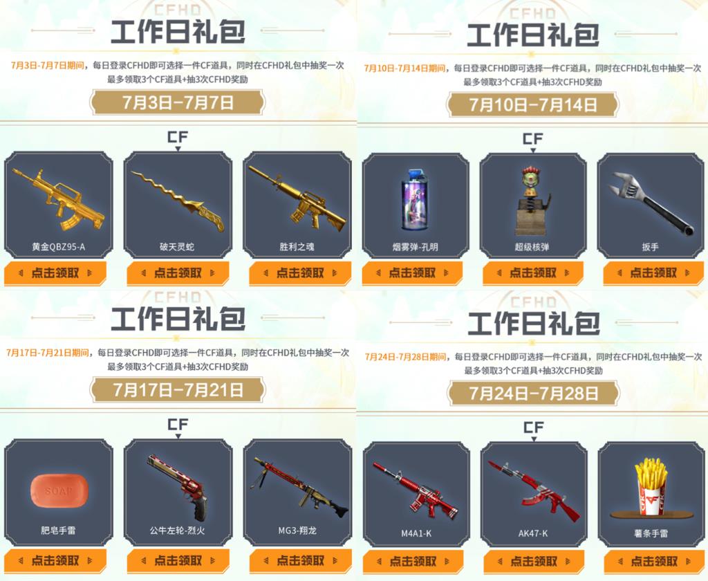 CF工作日礼包7月2023,活动期间登录CFHD即可选择一件CF道具,同时在CFHD礼包中抽奖一次,最多领取3个CF道具+抽3次CFHD奖励