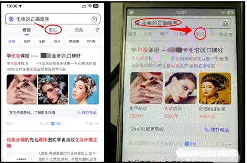 百度笔记,这里主要是指在百度移动端(即:百度APP和百度WAP)搜索某个关键词后搜索框上面有一个tag(标签)叫笔记,苹果和安卓手机APP显示位置不一样,苹果的靠前,如图。