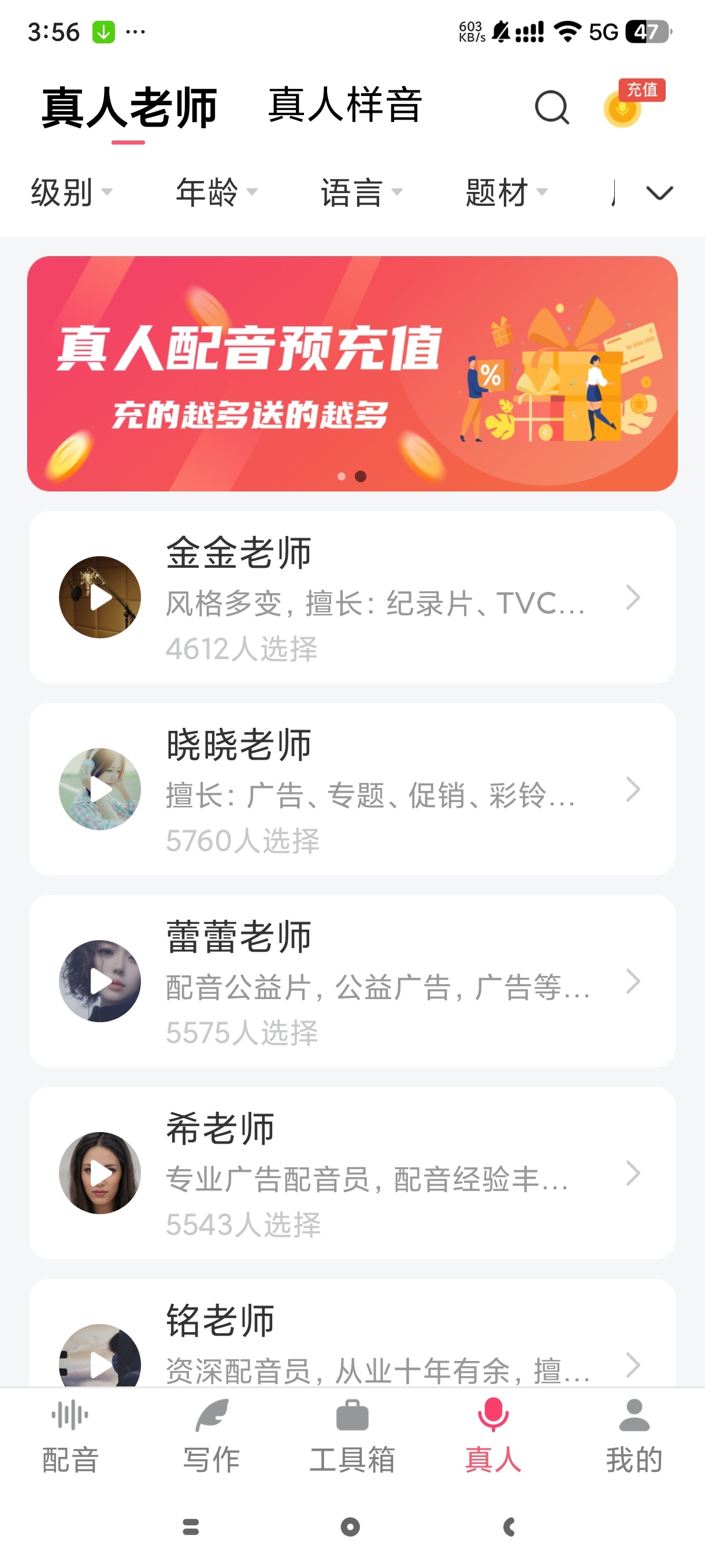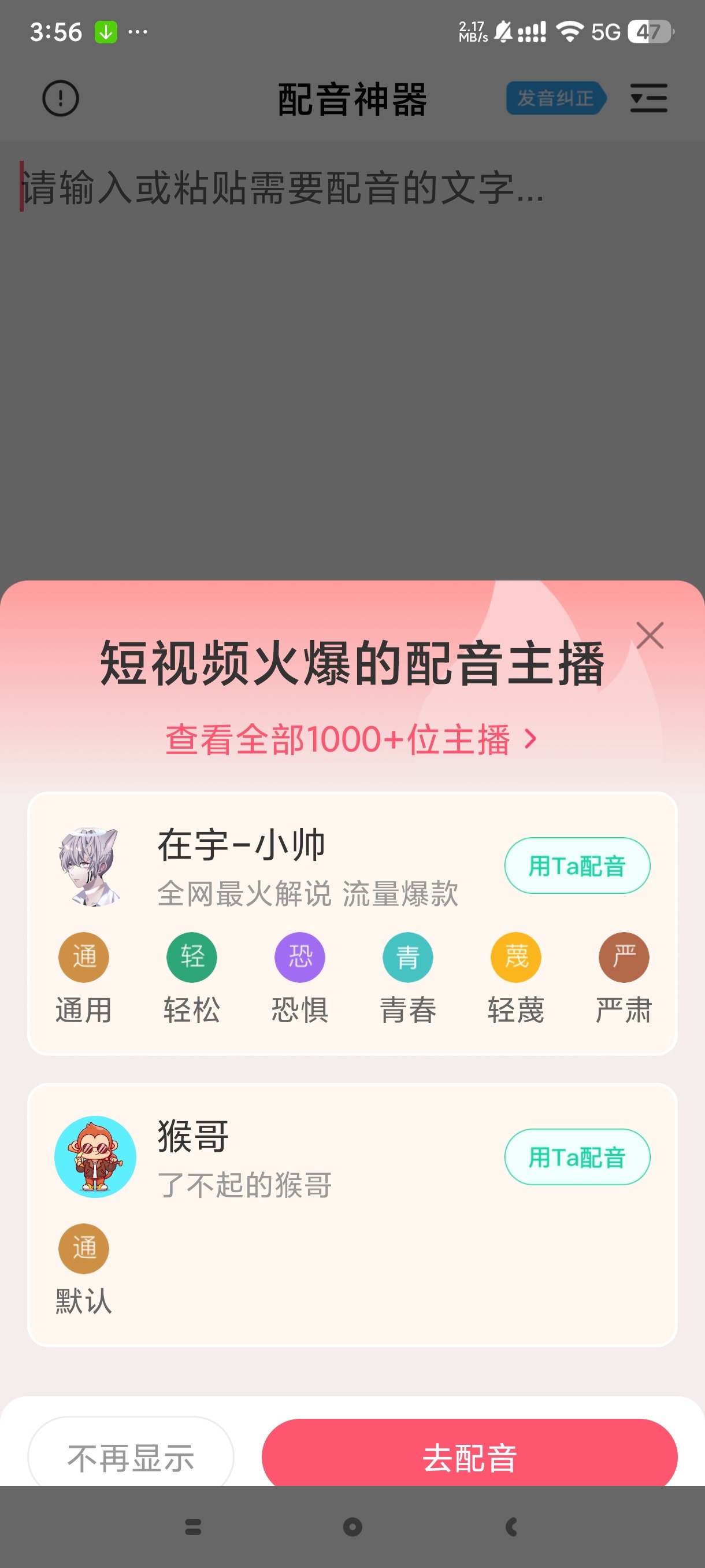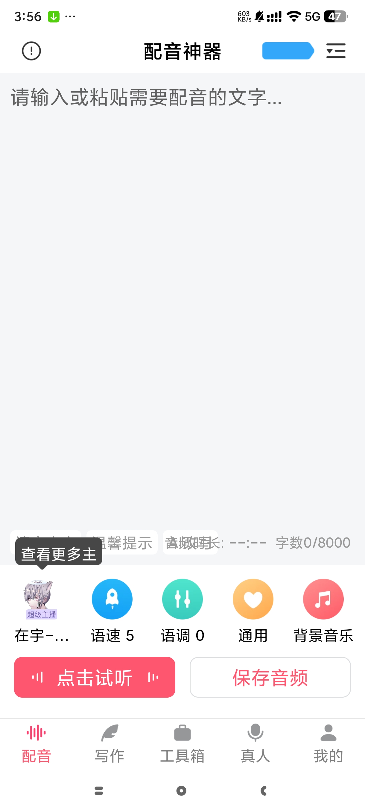 【应 用 介 绍】:配音神器是一款专注于文字转语音的智能语音合成软件,采用强大的语音合成技术,打造简单高效的配音服务平台。拥有近百位不同的主播,支持普通话、英语、粤语、四川话、东北话、湖南话、台湾话等多个音色。更有众多真人广告促销成品录音,一键导出。满足您的配音需求。提示合成失败换个主播音色就行