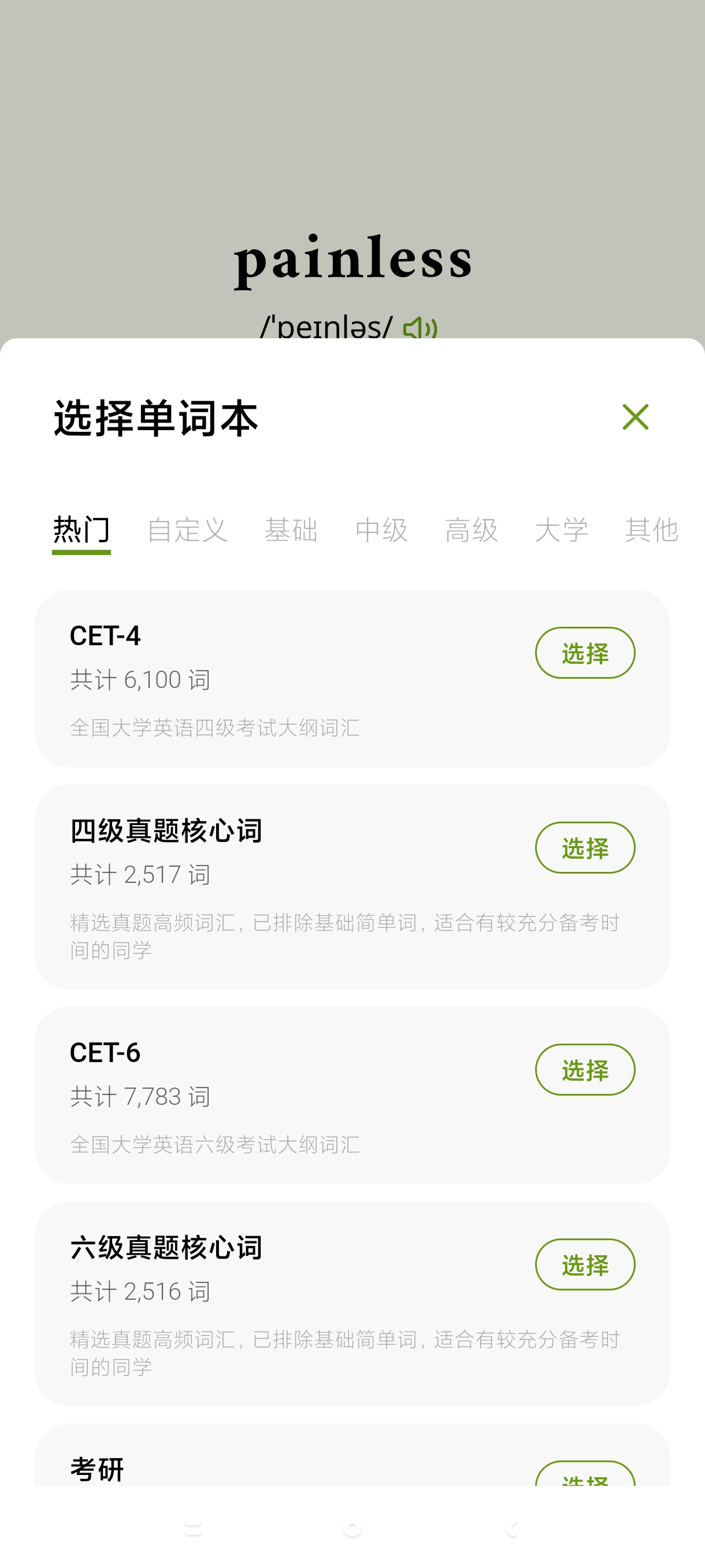 【应 用 介 绍】:无痛单词APP是一款适用于考研、学生党或想提升技能的职场人士使用的背单词软件,软件内置全阶段词库,涵盖小学至留学各阶段,并配备四级、雅思、GRE等考试专项词书,以刷短视频般的趣味体验重塑记忆模式。用户在无痛单词APP中通过上滑切换单词卡片,无痛单词app则依据停留时长自动判断掌握程度,告别传统手动标记的繁琐。同时其弹性学习计划打破"单词债"焦虑,允许用户随时开启或暂停学习,强调持续积累而非机械完成目标。另外无痛单词APP核心Painless智能算法深度分析用户行为数据,结合点击、搜索、阅读等多维度信息,动态生成个性化记忆曲线,实现精准复习,有需要的用户可以在本站免费下载使用。