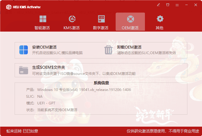 HEU KMS Activator 42.3.3 是一款很实用的 Windows+Office 激活工具,最近又是蛇年,所以本期也给大家带来个最新的2025蛇年限定版本的皮肤,非常好用,软件可以很强大,可以一键智能激活系统和office工具,完全免费使用。