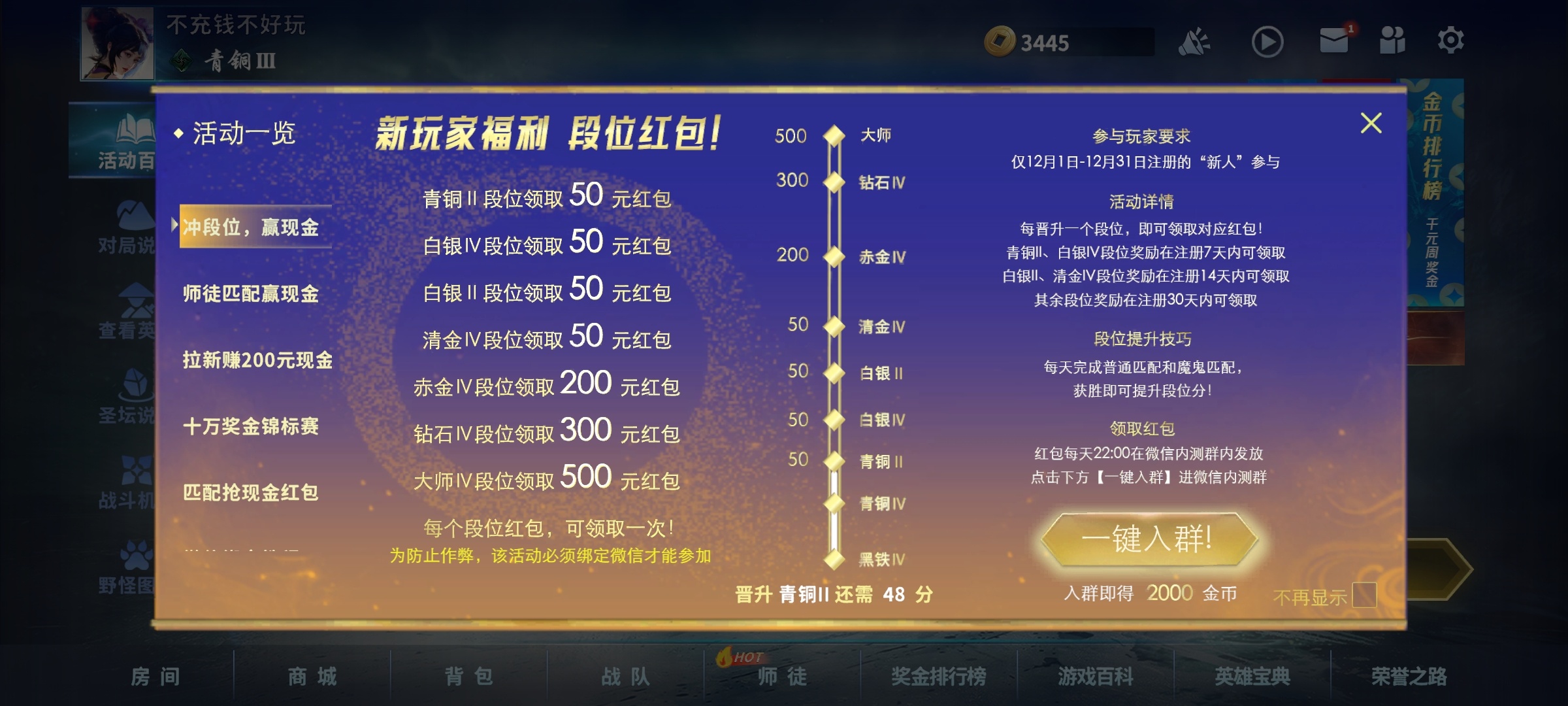 2达到青铜2可领50大洋 达到白银2可领50大洋