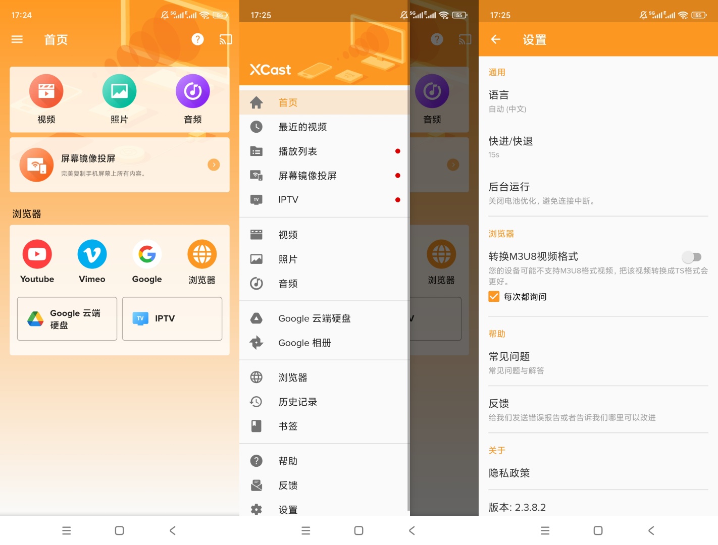 【官方介绍】:xcast投屏大师是一款功能强大、兼容性高的安卓投屏软件,旨在将手机、平板等移动设备上的内容无线投射到电视、电脑等大屏幕设备上,从而为用户带来更加震撼的视觉体验。无论您是想观看高清电影、享受大屏游戏,还是进行演示文稿,xcast投屏大师都能轻松满足您的需求。其操作界面简洁明了,无需复杂的设置和专业技能,用户只需几步简单操作即可实现投屏,非常适合初学者和非技术人员使用。