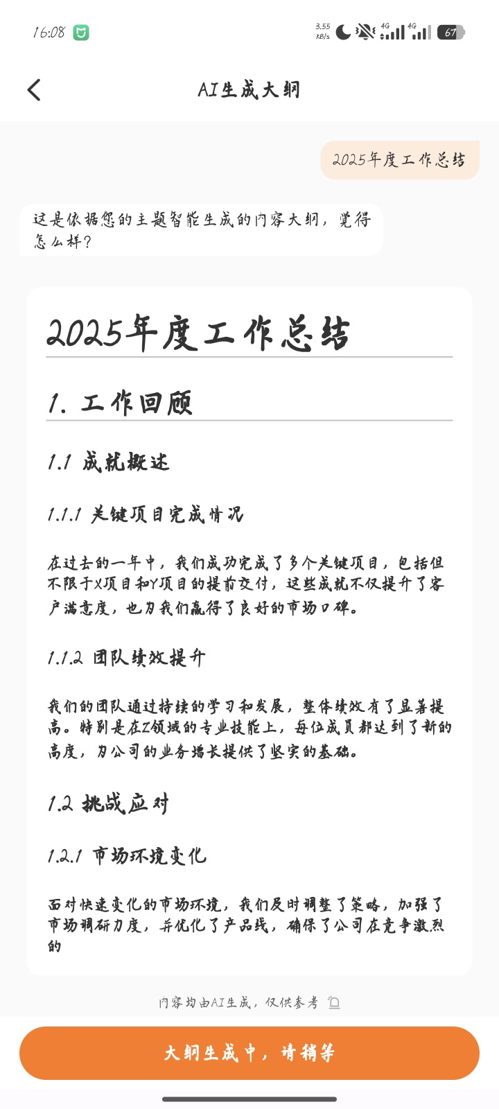 2. AI生成PPT:打开APP点击「AI PPT」,输入主题(如“2025年度工作总结”),等待AI生成大纲和完整演示文稿(实测生成效果见截图);