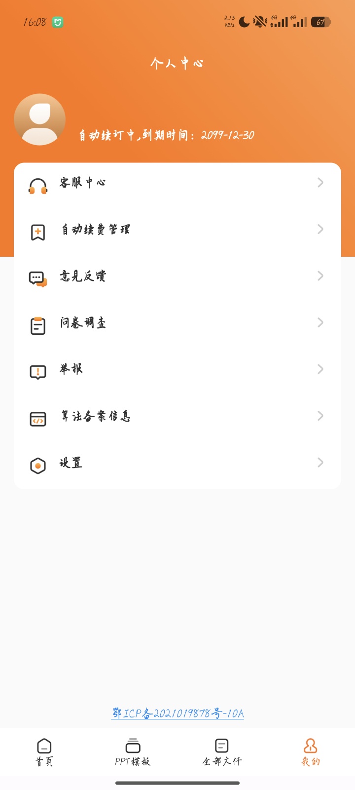 截图可见:AI生成的大纲逻辑清晰,会员模板风格多样,PPT预览效果精致,解锁后会员有效期至2099年,全功能无限制使用~