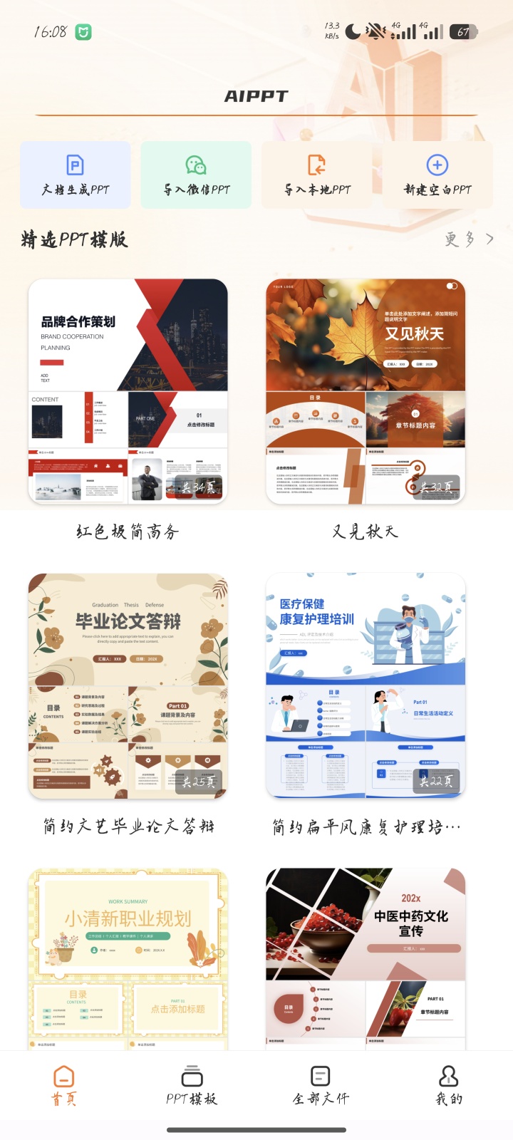 【软件介绍】:这款AI赋能的PPT制作工具,解锁会员版后可畅享全部付费模板+高级功能!内置千款全场景优质模板(工作总结、学术答辩、商务演示、校园活动等),风格涵盖简约高级、国潮古风、科技未来等(实测截图附后);支持输入主题AI一键生成完整PPT+智能大纲,还能导入Word、PDF快速整理内容,编辑功能超全面——插入图片、调整样式、添加动画特效,操作简单易上手,彻底告别熬夜做PPT的烦恼!