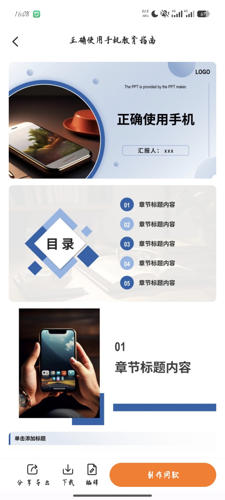 4. 导出分享:制作完成后,点击「分享导出」可保存为图片/PDF格式,也能直接分享至社交平台。