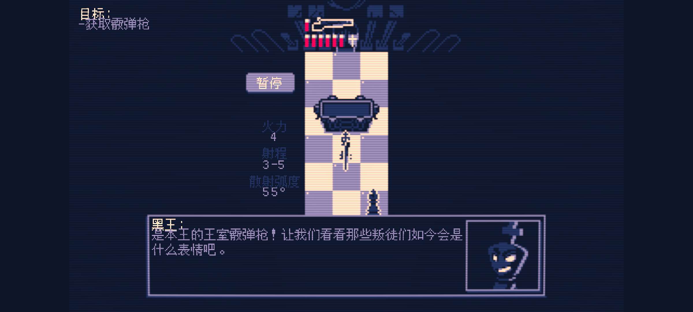 【游戏简介】《霰弹王:最终将杀》——一款极简主义回合制策略游戏,融合roguelike元素。玩家将操控一名配备霰弹枪的孤王,面对不断膨胀的敌方棋子大军。需谨慎规划每一步行动,管理弹药补给与阵型部署,并在每次胜利后选择强力升级。游戏以暗黑氛围、时尚画面及对经典棋类规则的巧妙重构,打造出紧张刺激的战术对决与高复玩性。